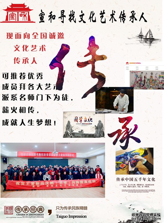 北京宣和书画艺术研究院为响应国家号召,弘扬中国传统文化,贯彻党的十九大报告提出的“文化自信,推动社会文化繁荣兴盛”的号召, 落实《中国文化振兴计划》,以“互联网+艺术”为指导思想,以传承中国传统文化艺术为宗旨,由北京宣和书画艺术研究院联手飞驰环球文化传播集团打造中国文化艺术行业唯一的“宣和·寻找文化艺术传承人”平台。涵盖传统文化艺术,书法、国画、油画、国学、中医、娱乐艺术、工美、瓷器、篆刻、非遗传承等。宣和艺术院整合国内文化艺术各大派系代表人物,挖掘社会优秀艺术人才,传承弘扬传统文化艺术,延续中华民族的文化脉络,将传统文化艺术发扬光大,针对社会在成长的艺术家和爱好者及青少年等,宣和传承平台可推荐优秀成员拜各大艺术派系名师门下为徒,薪火相传,成就人生梦想!
