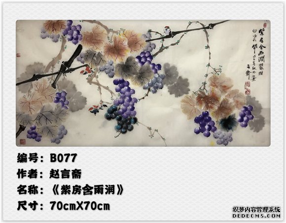 赵言斋先生专功花鸟,尤其擅长写意葡萄,近年来在国内外多次获奖,其作品被被人民大会堂及中外著名收藏家收藏,多次作为国礼赠送许多国家访华领导人。在赵言斋笔下,秋天是色彩绚烂的,颗颗丰硕葡萄是多姿多彩的。从美的评价出发,赵言斋先生的国画到达的是人心里的“自然”,心里想着什么,笔下就会涌现什么,笔下流露出的不再是简单意义上的写实,而是凝合心境的艺术品。