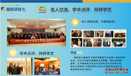 宣和传承平台联手飞驰环球集团可为传承人组织拜师仪式,并与千余家网络媒体合作联盟,面向全球推广宣传,让中国传统文化艺术以新的方式与世界文化、现代文明并存,并将传统文化艺术不断传承弘扬下去,焕发新的生机与活力!