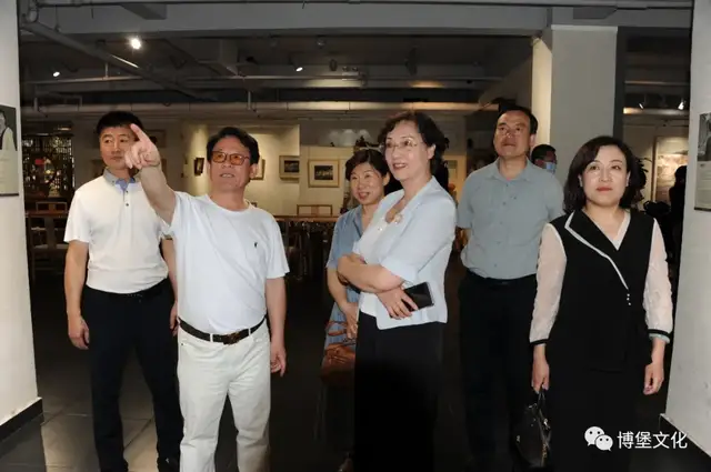 市美协主席钱宗飞、副主席秘书长崔志凌、副主席李金山、馆长刘贵斌陪同领导参观画展