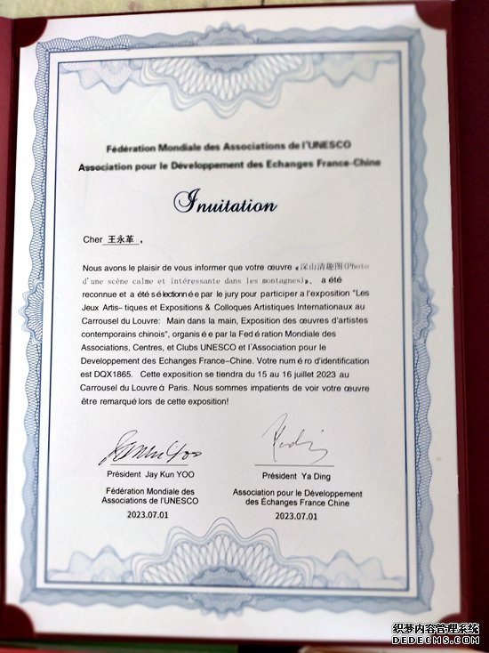 2023年7月15—16号,他的囯画作品《深山清趣》参加联合国教科文组织主办的——卢浮宫国际书画艺术联创巡展,获得卓越奖。