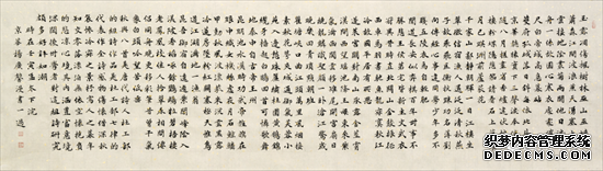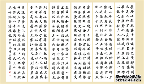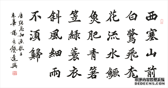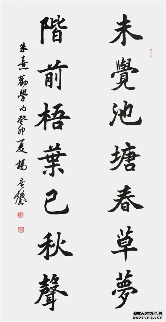 杨广馨先生真草隶篆四体皆攻,其中又以楷书和行草书见长。从学书开始他就确立了“行必以正取胜”的途径,并将典雅隽秀的“中和”书风作为自己的追求。杨先生的楷书以峻利疏朗、遒厚精古的魏碑为主,并借鉴了欧阳询、褚遂良的细腻轻灵笔法,法度严谨,清雅劲峭,体现了平和静雅的韵味。杨先生的行草书博采众长,既有“二王”的韵致,又继承了宋、明的天真烂漫,结体宽绰而不散漫,疏密搭配得宜,行气疏朗明晰,气势贯通,展现了一种豪放、浑穆的情致,给人以深刻的印象。